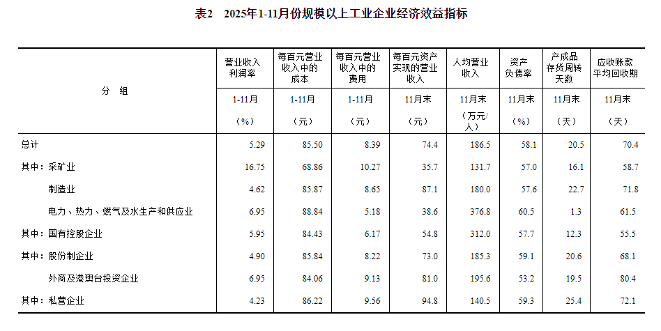 1。利润总额:指企业正在出产运营过程中各类收入扣除各类花费后的亏损,反映企业正在演讲期内实现的盈亏总额。2。停业收入:指企业处置发卖商品、包罗从停业务收入和其他营业收入。3。停业成本:指企业处置发卖商品、供给劳务和让渡资产利用权等出产运营勾当发生的现实成本。包罗从停业务成本和其他营业成本。停业成本该当取停业收入进行配比。4。资产合计:指企业过去的买卖或者事项构成的、由企业具有或者节制的、预期会给企业带来经济好处的资本。7。应收账款:指资产欠债表日以摊余成本计量的,企业因发卖商品、供给办事等运营勾当应收取的款子。8。产成品存货:指企业曾经完成全数出产过程并验收入库,能够按照合同的前提送交订货单元,或者能够做为商品对外发卖的产物;以及外购或委托加工完成验收入库用于发卖的各类商品。11。每百元停业收入中的费用=(发卖费用+办理费用+研发费用+财政费用)÷停业收入×100,单元:元。17。正在各表的利润总额同比增加栏中,标“注”的暗示上年同期利润总额为负数(即吃亏)或为0。0亿元;数值为负数的表白利润同比增加;数值正在0至-100%之间(不含0)的表白利润同比下降;下降幅度跨越100%的表白由上年同期盈利转为本期吃亏;数值为0的表白利润取上年持平。二、规模以上工业企业利润总额、停业收入等目标的增速均按可比口径计较。演讲期数据取上年所发布的同目标数据之间有不成比要素,不克不及间接比拟计较增速。其次要缘由是:(一)按照统计轨制,每年按期对规模以上工业企业查询拜访范畴进行调整。每年有部门企业达到规模尺度纳入查询拜访范畴,也有部门企业因规模变小而退出查询拜访范畴,还有新建投产企业、破产、注(吊)销企业等变化。(二)加强统计法律,对统计法律查抄中发觉的不合适规模以上工业统计要求的企业进行了清理,对相关基数依规进行了批改。(三)加强数据质量办理,剔除跨地域、跨行业反复统计数据。1—11月份,规模以上工业企业利润增速有所回落,但仍然延续8月份以来的增加态势,以配备制制业、高手艺制制业为代表的新动能行业连结较快增加,工业经济转型升级有序推进。工业企业利润和停业收入连结增加。1—11月份,规模以上工业企业利润同比增加0。1%,自本年8月份以来累计增速持续四个月连结增加。从三大门类看,1—11月份,制制业增加5。0%;电力、热力、燃气及水出产和供应业增加8。4%;采矿业下降27。2%,降幅较1—10月份收窄0。6个百分点。1—11月份,规模以上工业企业停业收入同比增加1。6%。配备制制业利润带动感化较着。1—11月份,规模以上配备制制业利润同比增加7。7%,拉动全数规模以上工业企业利润增加2。8个百分点,是对规模以上工业企业利润增加拉动感化最强的板块。从行业看,配备制制业的8个大类行业中有7个行业利润实现同比增加,此中,铁船舶航空航天、电子行业利润两位数增加,增速别离达27。8%、15。0%;汽车行业利润增加7。5%,较1—10月份加速3。1个百分点;通用设备、公用设备、电气机械行业利润继续增加,增速别离为4。8%、4。6%、4。2%。高手艺制制业利润增速加速。1—11月份,规模以上高手艺制制业利润同比增加10。0%,较1—10月份加速2。0个百分点,增速高于全数规模以上工业平均程度9。9个百分点。从行业看,“人工智能+”步履深切实施带动相关设备制制行业利润向好,电子工业公用设备制制行业利润同比增加57。4%,此中半导体器件公用设备制制、电子元器件取机电组件设备制制行业利润别离增加97。2%、46。0%;航空航天财产快速成长鞭策行业利润增加较快,航空、航天器及设备制制行业利润同比增加13。3%,此中航天相关设备制制、航空相关设备制制行业利润别离增加192。9%、36。3%;智能化产物帮力数智化转型,智能消费设备制制行业利润同比增加54。0%,此中智能车载设备制制、智能无人飞翔器制制、其他智能消费设备制制行业利润别离增加105。7%、76。6%、58。1%。原材料制制业利润较快增加。1—11月份,规模以上原材料制制业利润增加较快,同比增速达16。6%,拉动全数规模以上工业企业利润增加2。0个百分点。从行业看,自本年以来,钢铁行业盈利情况改善较着,叠加低基数要素,行业利润同比大幅增加;正在市场需求添加、营收增加较快的带动下,有色行业利润连结两位数增加。总体看,规模以上工业企业利润延续增加态势,工业新动能的支持感化进一步。但也要看到,国际不不变不确定要素较多、工业新旧动能转换仍面对布局调整压力,工业企业效益恢复根本还需继续巩固。下阶段,要全面贯彻落实地方经济工做会议,鞭策保守财产升级,鼎力培育新质出产力,加速扶植现代化财产系统,鞭策工业经济持续健康成长。