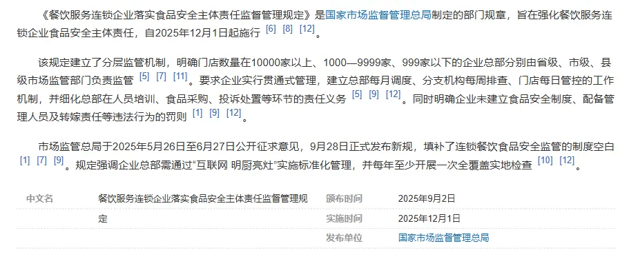 近日,国度市场监管总局发布《餐饮办事连锁企业落实食物平安从体义务监视办理》,明白 2025 年 12 月 1 日起正式施行。